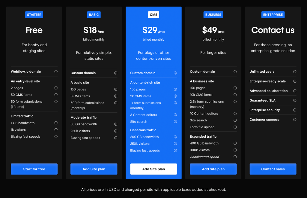 On the one hand, Webflow’s pricing model is relatively affordable when compared to other web design tools on the market. Its basic plan starts at $15 per month, and its more advanced plans offer additional features and capabilities for a higher price point. Webflow still offers a free trial period, which allows users to test out the platform before committing to a paid plan.